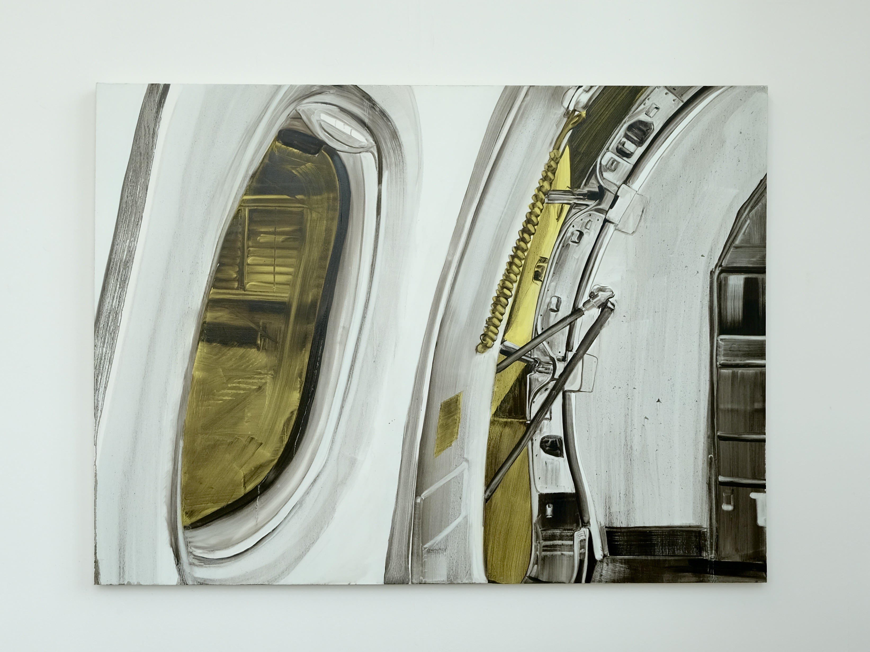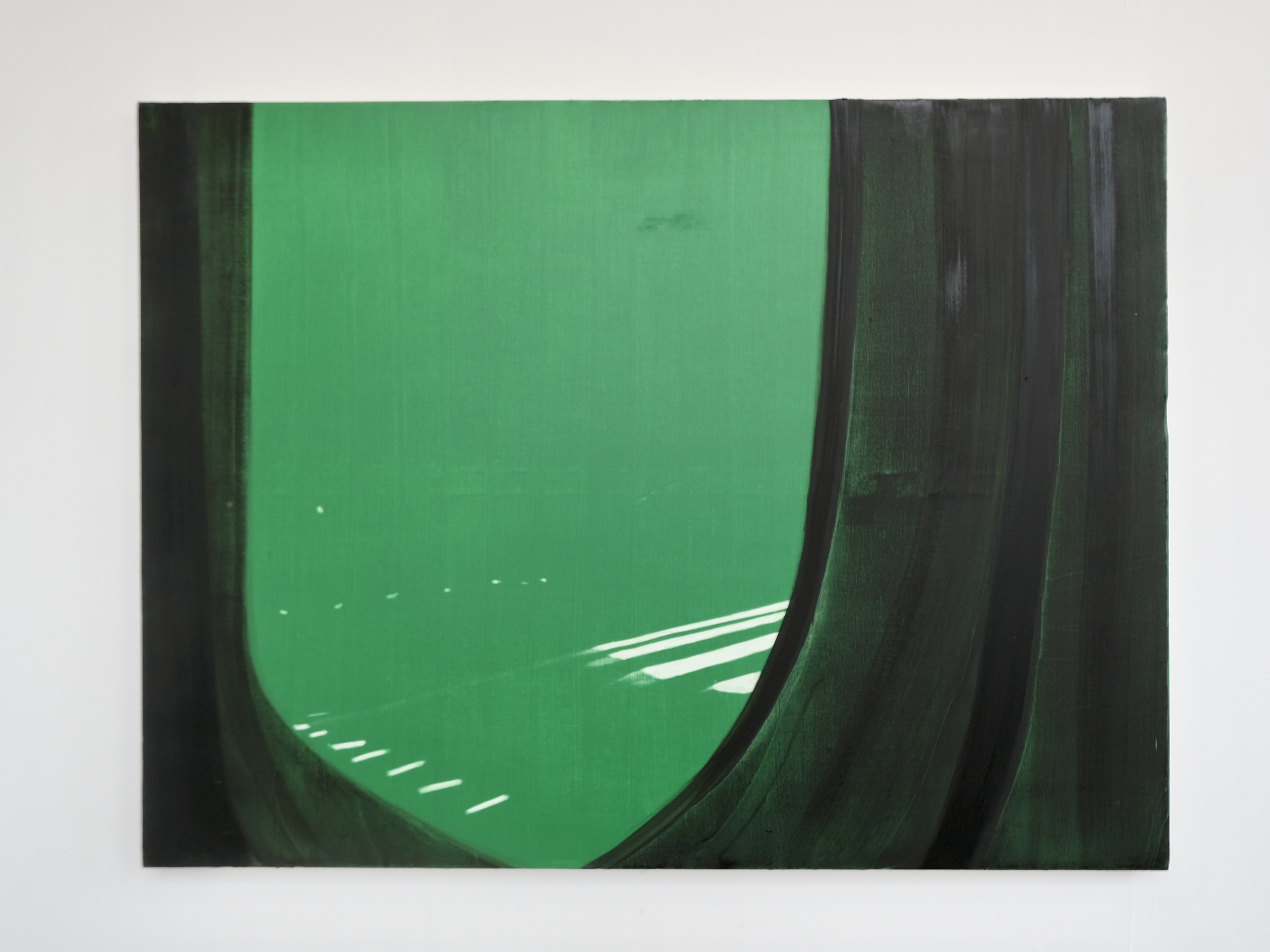 I am inspired by the blankness of images one sees when travelling, lost in thought, and the post-industrial landscapes that pass the window at high speed. The images I paint are blank stares, gazing into the distance – similar to the feeling of travelling home and being consumed by my thoughts or feelings. The detachment of your inner consciousness and your surroundings intrigues me.